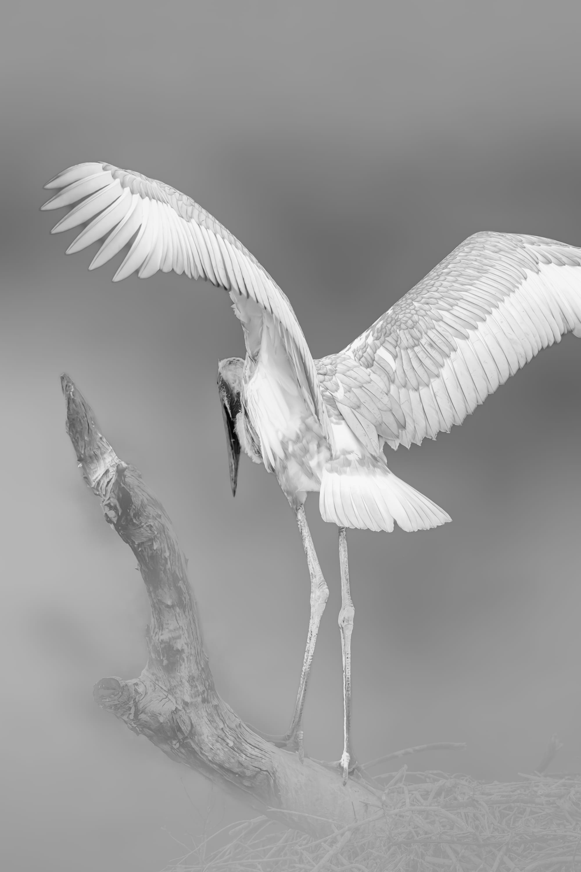 "Jabiru stork fledgling preparing for flight in Pantanal, Mato Grosso, Brazil."