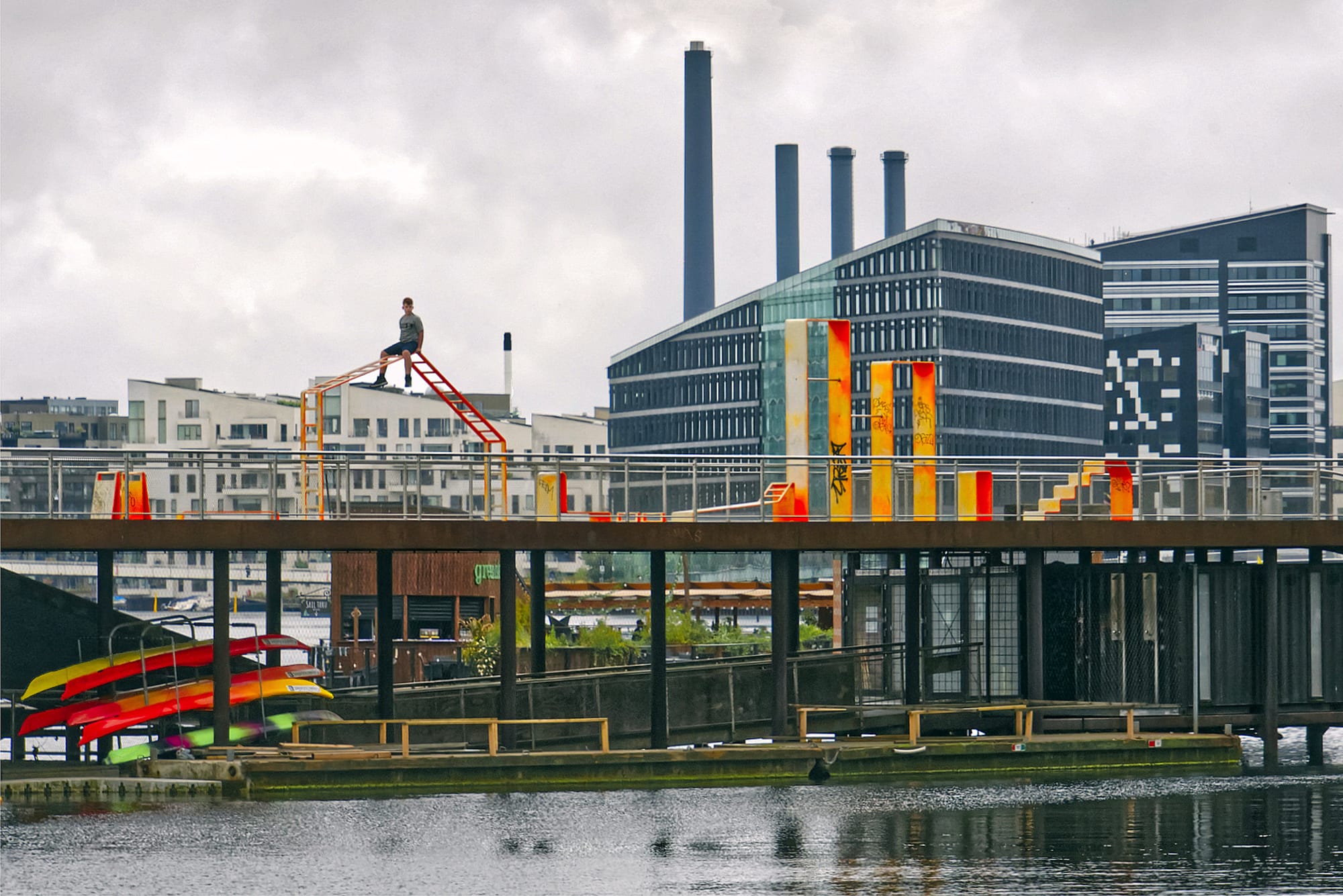"I captured this scene during a trip to Copenhagen, Denmark, in 2023. I was intrigued by a young boy seated on top of some bars, looking out over a predominantly industrial area of the city. The image also includes an area of greenery and some canoes, indicating that recreation is possible in this area. This photograph matters to me because it illustrates the relationship between one small human and his complex city environment. I wonder what he is thinking."