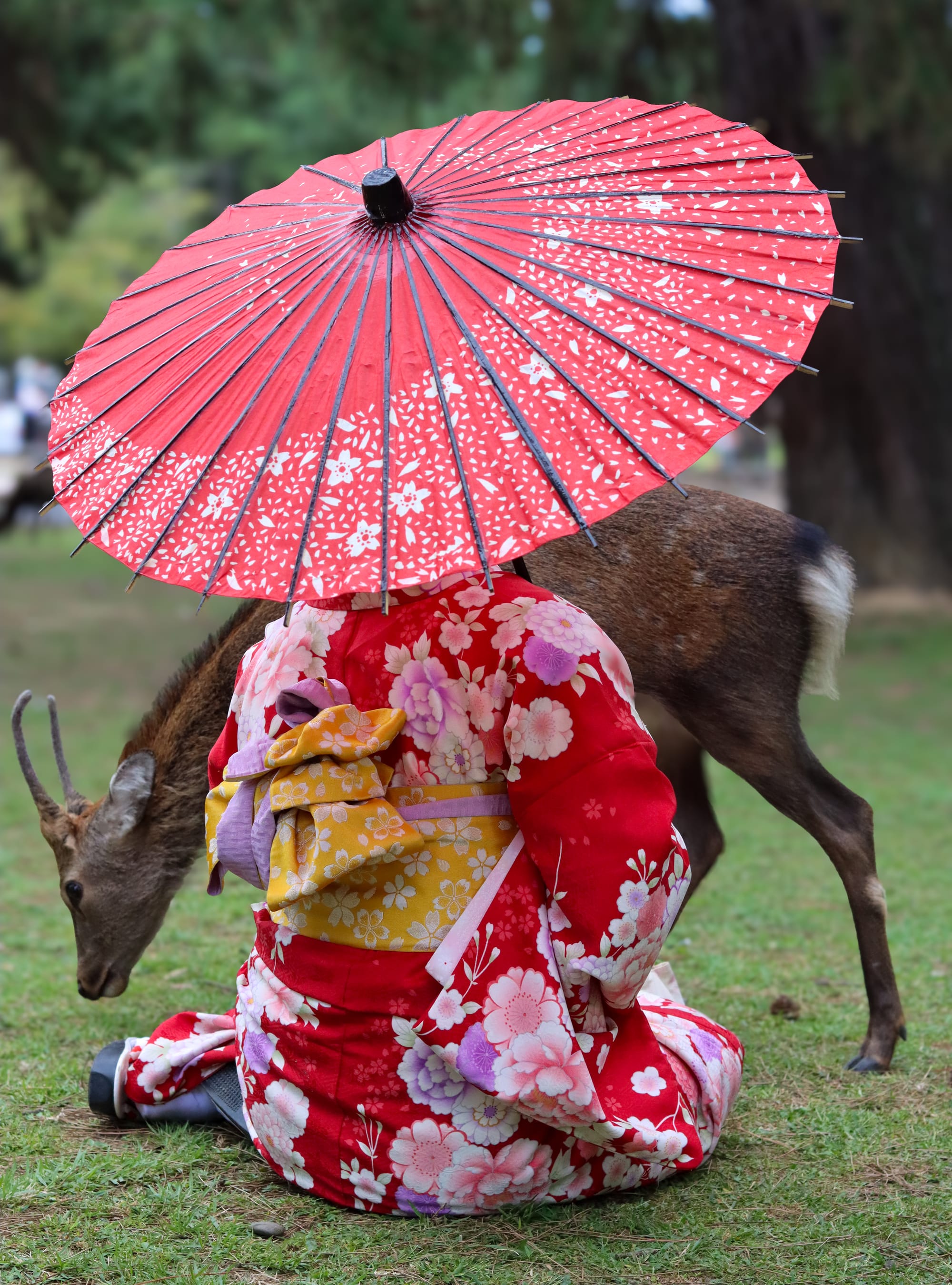 "Nara, a town close to Osaka, is known for its deer that wander freely around the temples and into the town. The deer are considered sacred animals here, known for being gentle and friendly. Harming them would incur punishment. This woman was posing for a friend, and I managed to sneak up behind her to take this photo."
