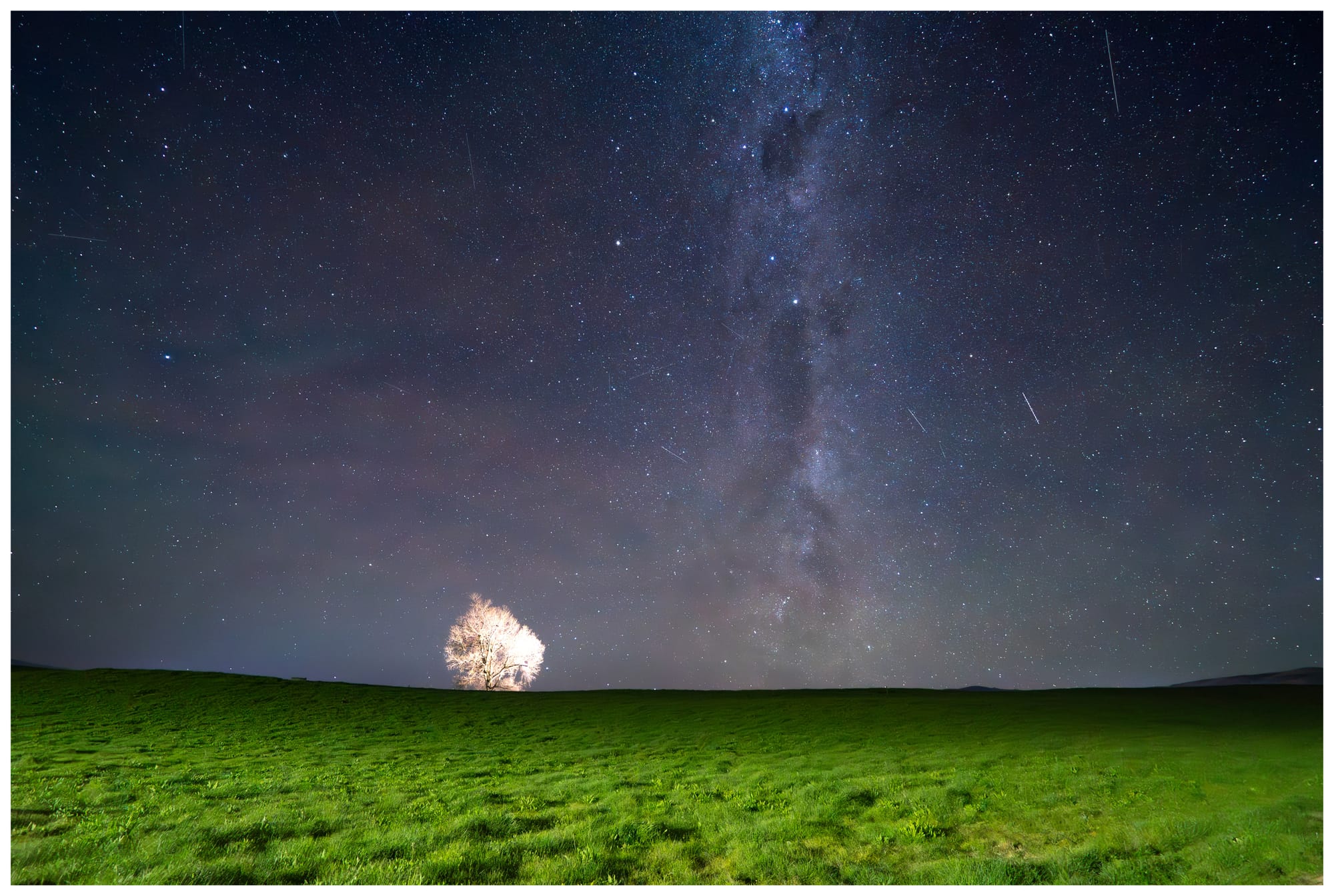 "Side lighting illuminates a leafless, solitary tree in a paddock, lit by a nearby street light. Otago, New Zealand."