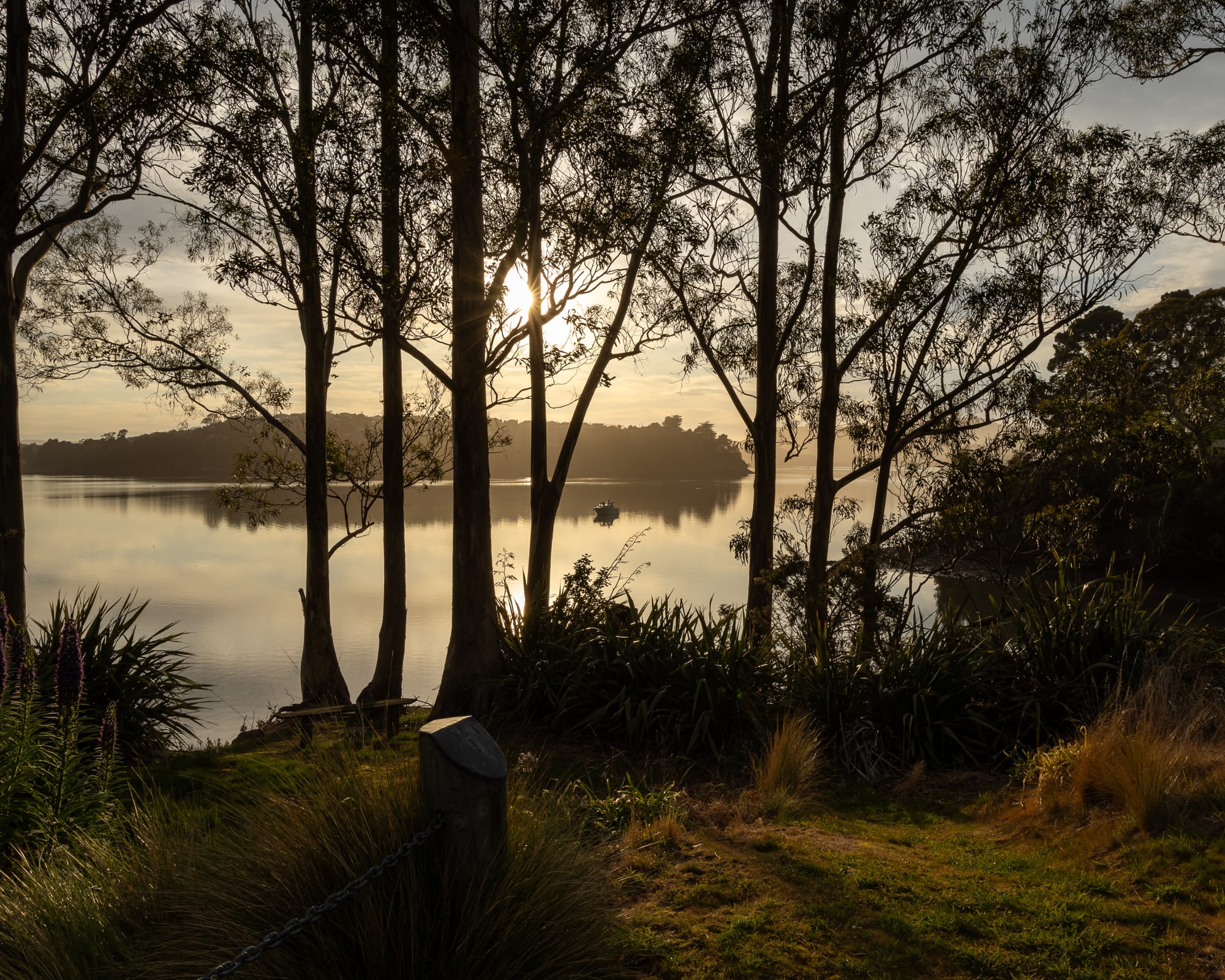 "A very early morning, end-of-summer sunrise over the Port Chalmers Roseneath harbour area. The nuances of light reflect in the water and onto the grass, creating a lovely tranquil moment before the chaos of a workday begins."