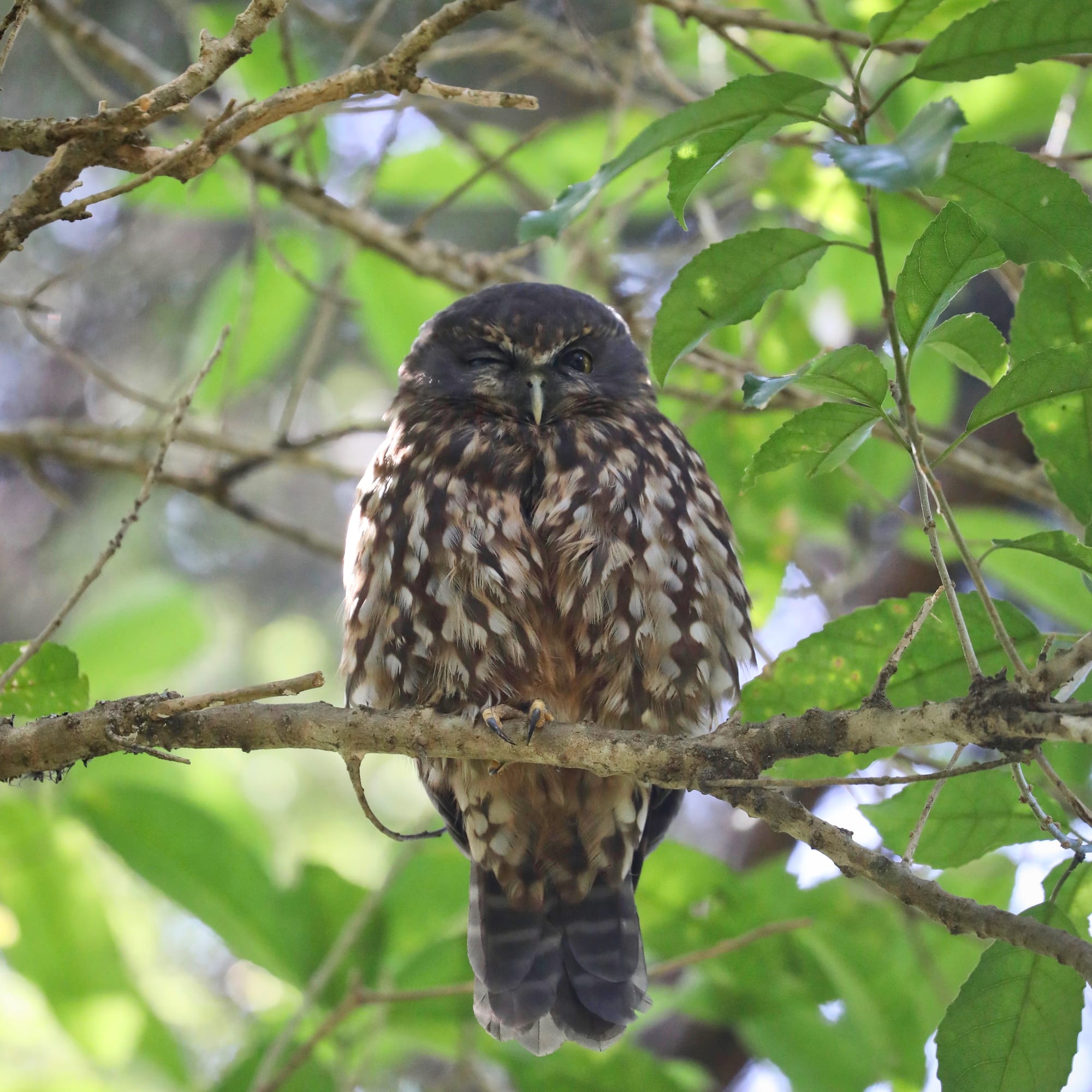 "A ruru roosting along the Ecology Trail one morning at Tāwharanui, briefly awake from its slumber."