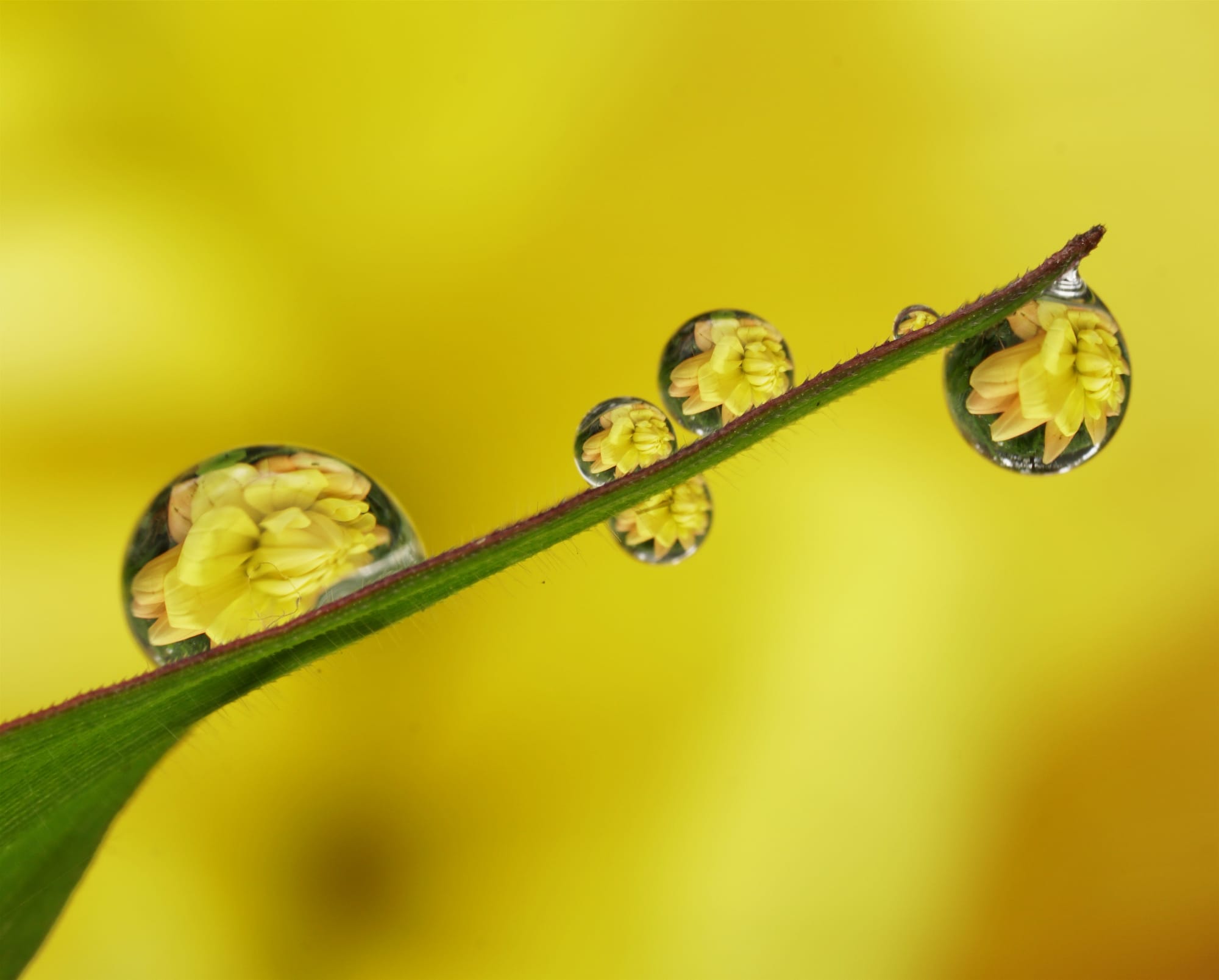 "A yellow dahlia reflected in a collection of water drops on a blade of grass."