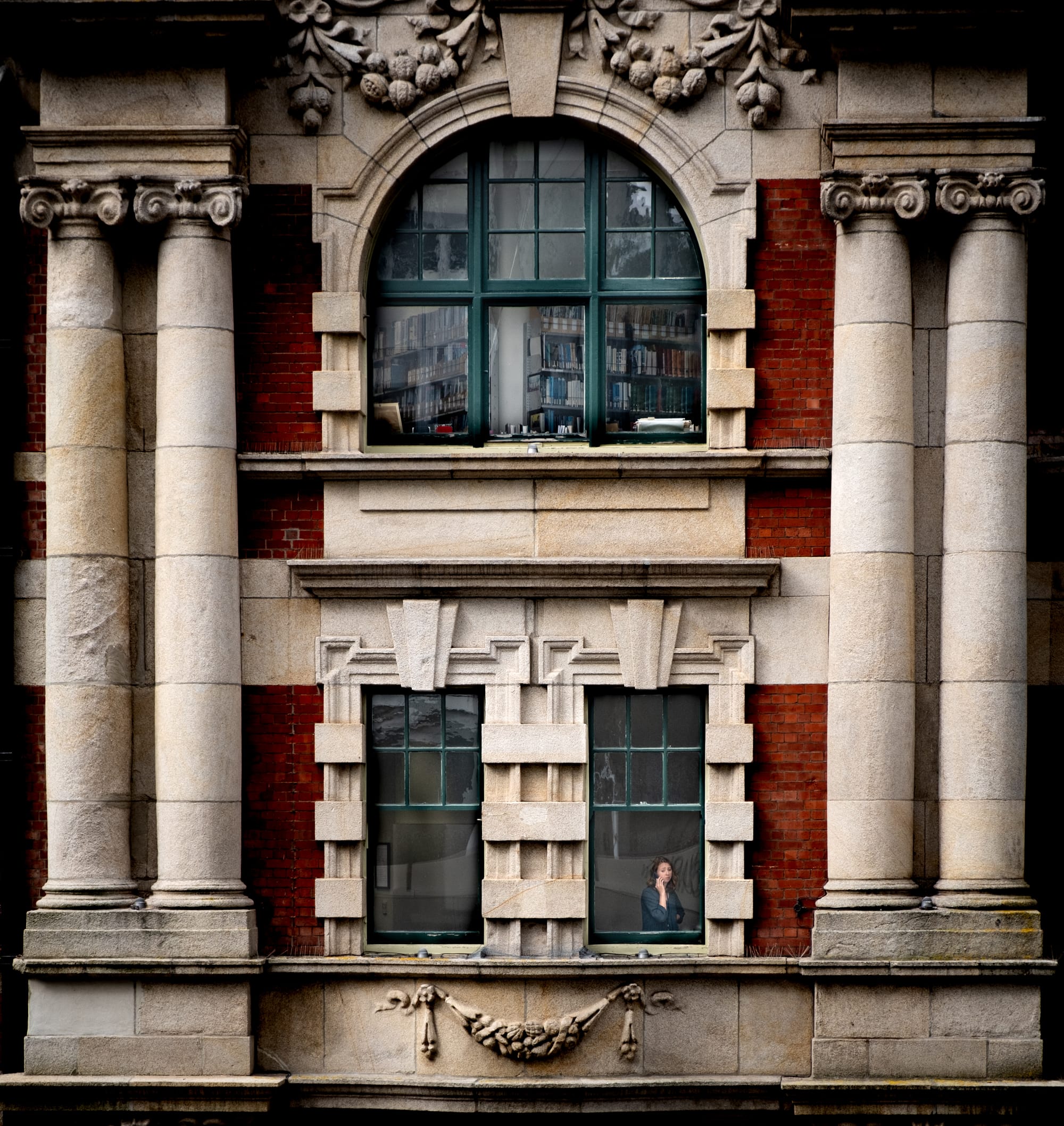 "The Public Trust Building in Wellington. I was about to head home when I decided to stop off in a car park and photograph this iconic building from across the street. I was lucky and delighted to find someone visible in one of the windows. The result juxtaposes the ornate and extraordinary architecture with the utterly mundane view of someone on the phone."