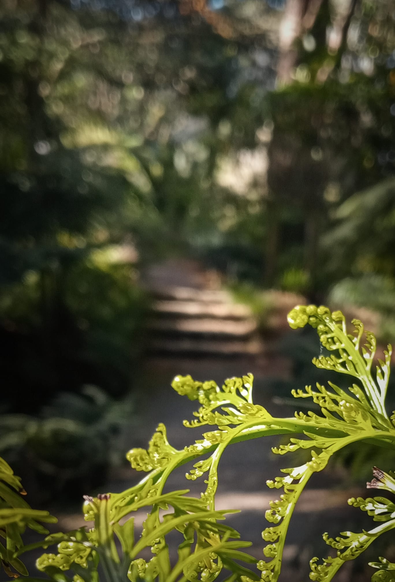 "Baby fern growing amongst the shadows, with a darkened pathway in the background."